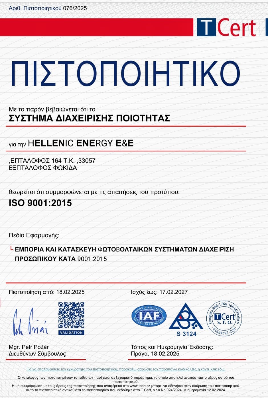 Η Hellenic Energy είναι πιστοποιημένη σύμφωνα με το διεθνές πρότυπο ISO 9001:2015 για τη διαχείριση της ποιότητας.